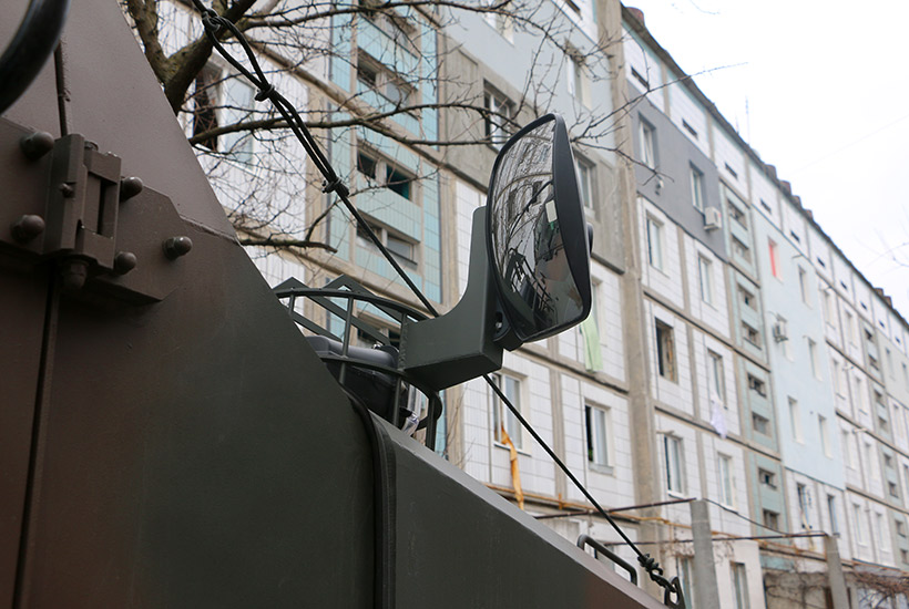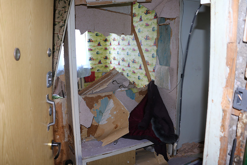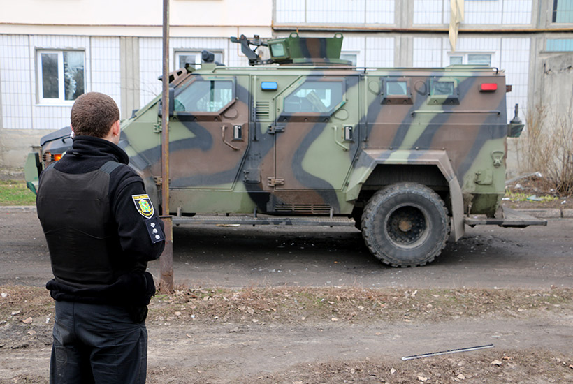 На бронированной машине бойцы отряда специального назначения вместе с сотрудниками полиции отправились во взрывоопасный район города для эвакуации тела женщины, которая умерла накануне чрезвычайного происшествия.