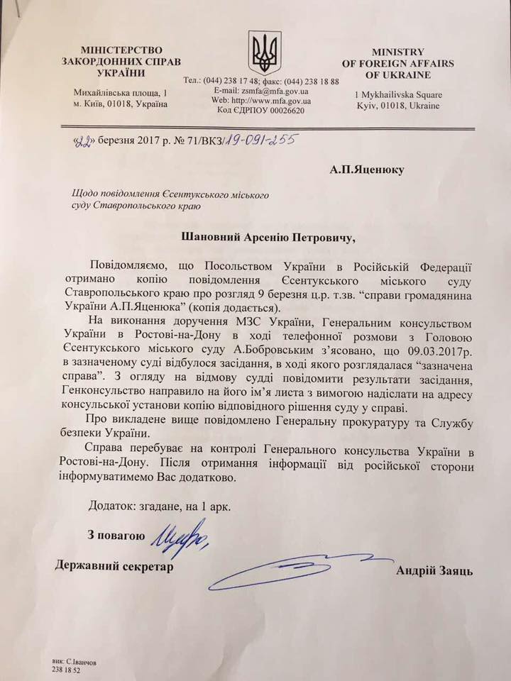 Посольство України в Росії отримало копію повідомлення Єсентукського міського суду Ставропольського краю.