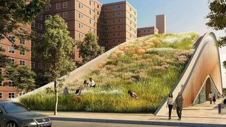 Компания Kohn Pedersen Fox выпустила концептуальную визуализацию четырнадцати травяных холмов, которые расположат вокруг домов в Ред-Хук. Эти сооружения содержат механизм, который обеспечит резервное питание и тепло в домах, а также будут выступать в качестве дамб.