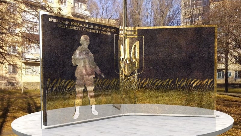 Участники АТО также показали эскиз памятника. Внешне он напоминает раскрытую книгу с изображением фигуры солдата и надписью: «Вечная слава воинам, которые погибли, защищая независимость и суверенитет Украины».