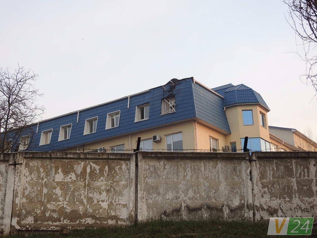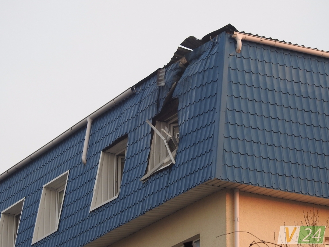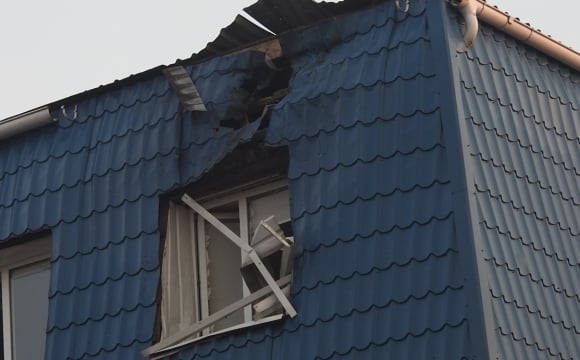 В результате обстрела в крыше помещения образовалась дыра диаметром 70 см, окно под этим местом разбито.
