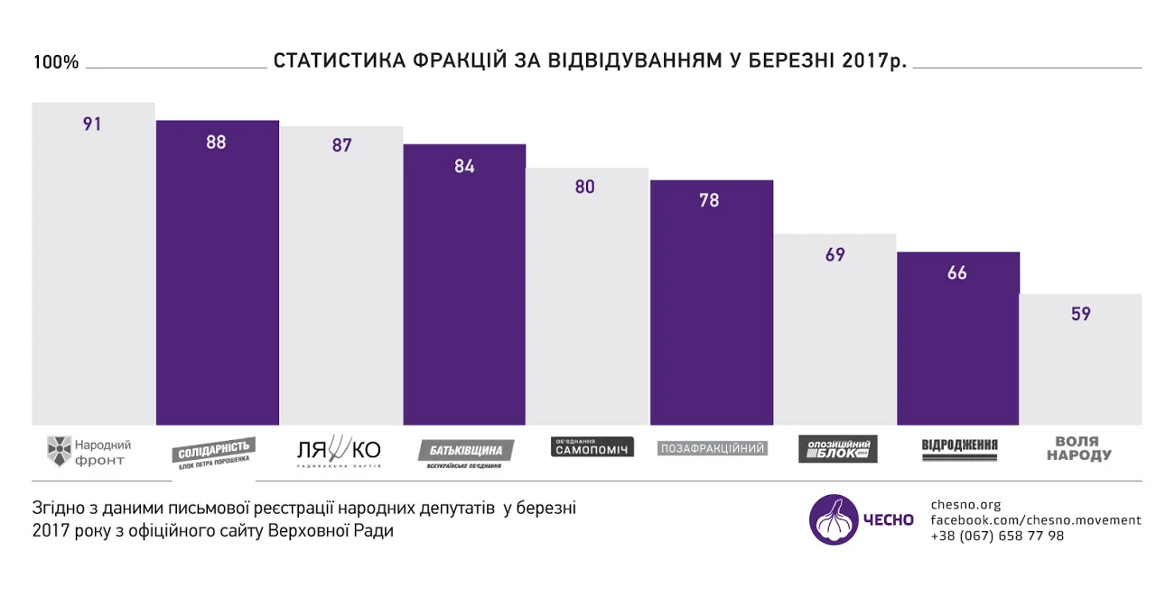Про це повідомляє Громадський рух ЧЕСНО, який проаналізував відвідуваність народних депутатів за березень 2017 року. 8 нардепів не зареєструвалися письмово з невідомих причини і жодного разу не голосували. Найгірше ходили на роботу депутати “Волі народу”.