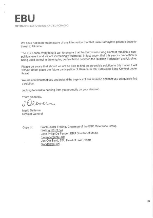 В этом документе Дельтенре также предупредила Гройсмана, что Украину могут исключить из будущих состязаний, если власти в Киеве не разрешат въехать в страну российской участнице конкурса Юлии Самойловой. Кроме того, она уведомила украинского премьера о том, что некоторые участники конкурса размышляют о возможности его покинуть.
