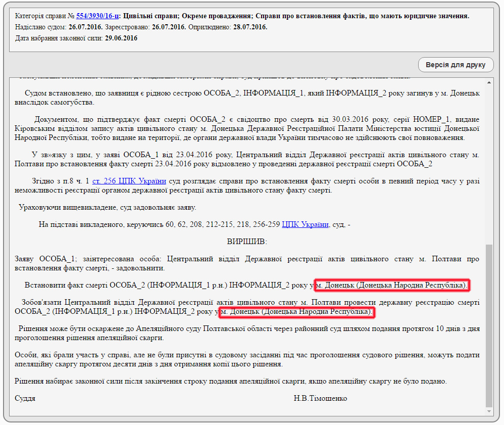 Октябрьский районный суд Полтавы 16 июня 2016 года принял решение, в котором указал Донецк как город в составе "Донецкой народной республики".