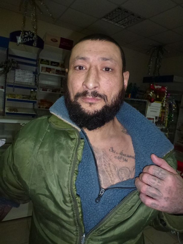 Тело террориста покрыто тюремными татуировками, а вместо руки у него протез с штык-ножом. На камеры он рассказывал, что якобы шел на "бой с укропами" с молотком вместо руки.