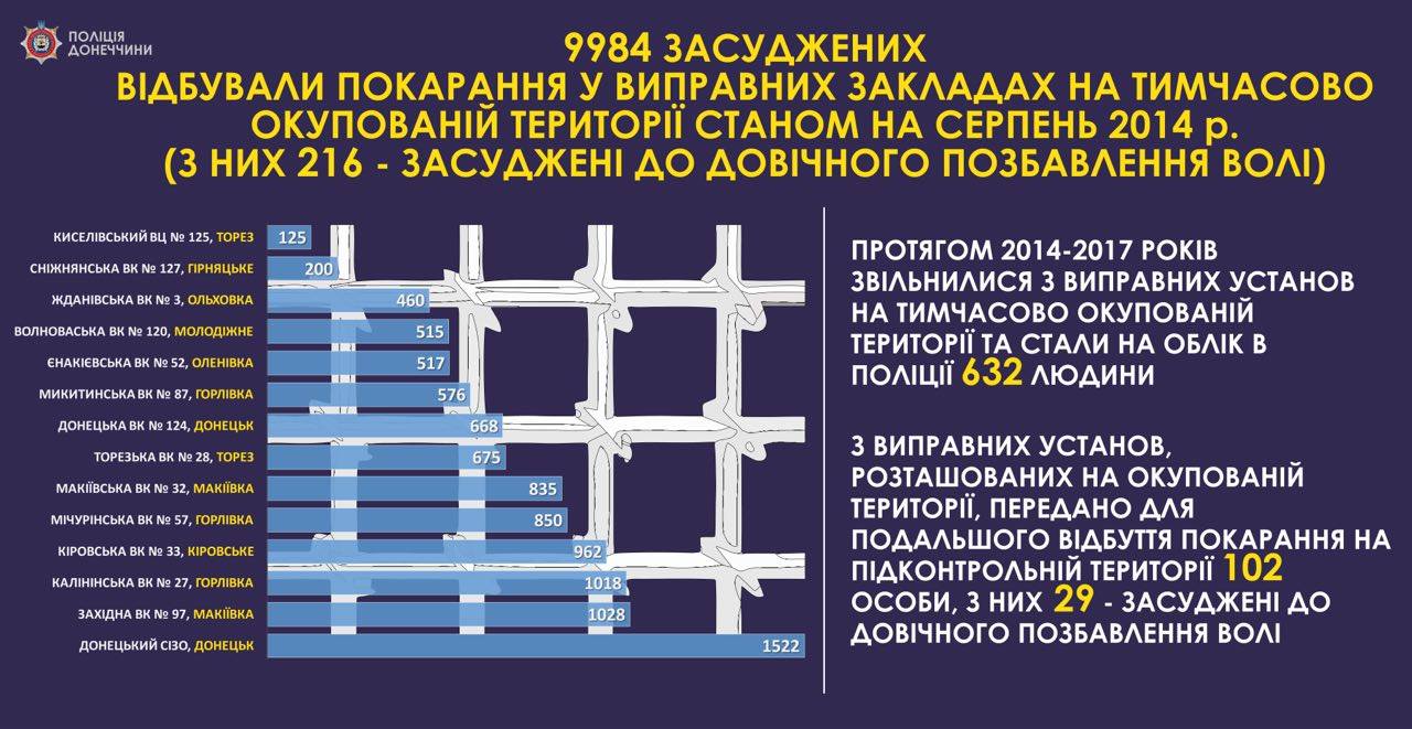 У пенітенціарній системі так званої "ДНР" на теперішній час "працює" 2576 чоловік. Поліцією Донеччини встановлена причетність і зібрана доказова база щодо 400 колишніх співробітників управління пенітенціарної служби Донецької області. Шестеро особливо "завзятих" тюремників оголошені в розшук, п'ятеро – засуджені. Робота в даному напрямку триває.