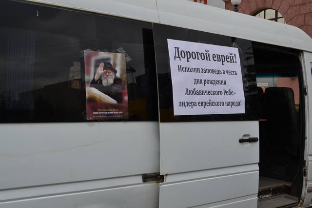 "Дорогой еврей, исполни заповедь в честь дня рождения Любавичского ребе - лидера еврейского народа!" - говорится на плакате, размещенном на автомобиле организаторов акции.