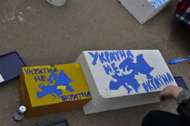 На площади Свободы в Харькове сегодня, 7 апреля, проходит патриотическая акция "Блок Post". Студенты Харьковской государственной академии дизайна и искусств наносят на пеноблоки патриотические рисунки и государственные символы Украины. Затем из 20 блоков они построят стену.