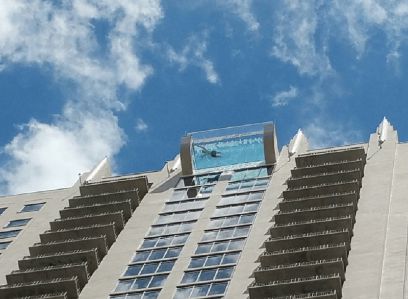 Уникальность Sky Pool состоит в том, что часть бассейна на 3 метра выходит за пределы крыши и «свисает» на 42-м этаже.