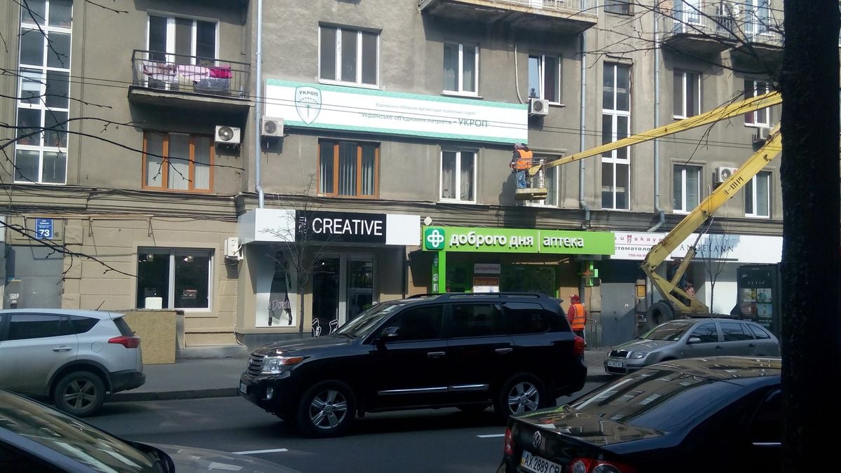 Сьогодні вранці до будівлі де розташований офіс Харківської обласної організації ПП «Українське об’єднання патріотів – УКРОП» приїхали співробітники Департаменту контролю Харківської міської ради з бригадою робочих, котрі демонтували вивіску УКРОПу з фасаду будівлі. Банер обласної організації комунальники забрали із собою. Самаж конструкція залишилась на фасаді будівлі.