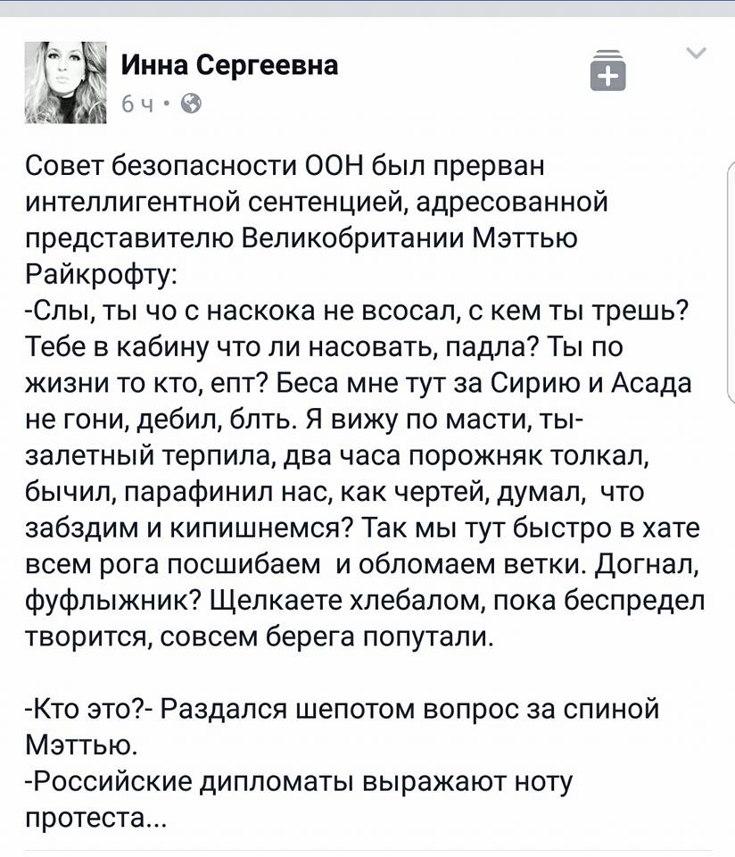"Ты сегодня говорил, господин Райкрофт, не по повестке дня заседания. Оскорблял Сирию, Иран, Турцию, другие государства... Не смей оскорблять Россию больше", - истерично завершил представитель РФ.