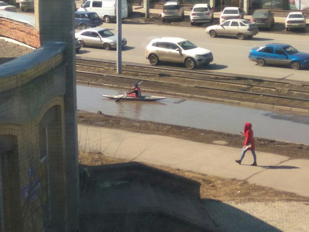 Кстати, в Омске, судя по всему, с лужами весной все в порядке. «Росбалт» недавно писал, что там мужчина проплыл по огромной луже на байдарке.