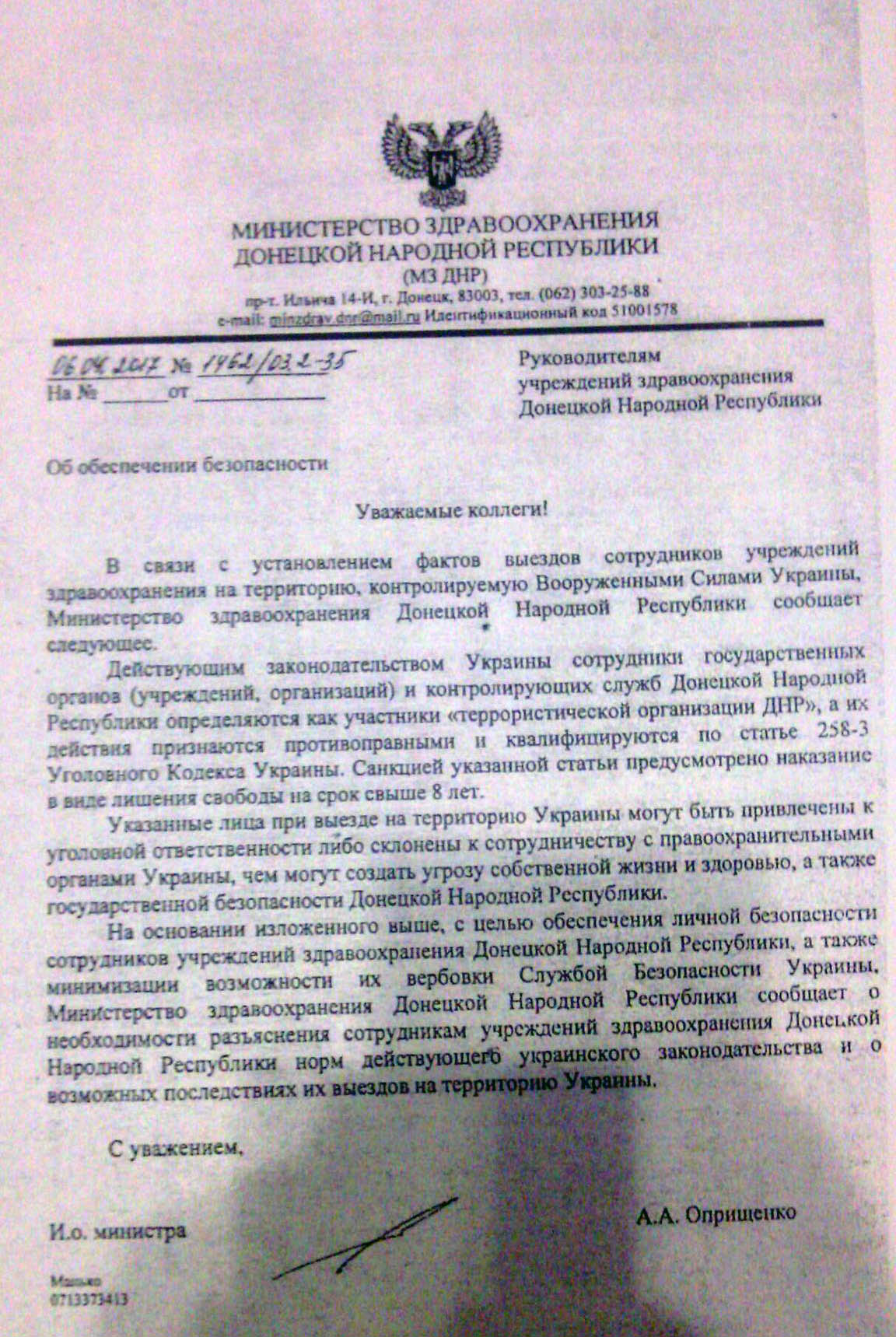 Сообщается также, что запрещен выезд медперсонала с территории, подкорнольной боевикам.