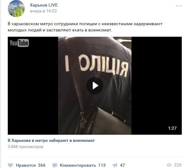 В 2016 году, когда Харьков захлестнула волна уличных облав на молодежь с целью выполнения плана призыва на срочную службу в ситуацию был вынужден вмешаться глава МВД, который однозначно дал понять правоохранителям, что сотрудники полиции не имеют права участвовать в противозаконных похищениях людей, которые устраивают военкоматы. А правозащитники расценивают подобные действия сотрудников военкоматов именно, как уголовное преступление - похищение.