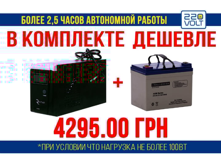Магазин 220 Volt объявил скидку на комплект из ИБП RITAR RTSW-600, 12В Q4 и АКБ Challenger A12‒35, способный обеспечивать до 2.5 часов работы электрооборудования мощностью до 100 Вт. Цена комплекта — 4295 грн.