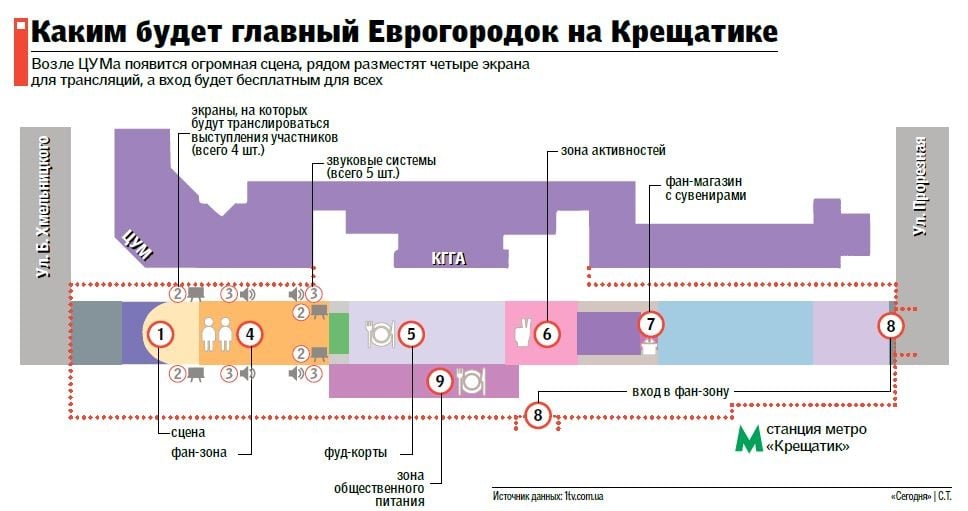 Свезли и оборудование для строительства сцены, которую монтируют возле ЦУМа. "Сцена в Eurovision Village будет второй по размерам после арены в МВЦ, а общая площадь Еврогородка — 13 тысяч квадратных метров", — говорят организаторы. Рядом с ней появятся огромные экраны, на которых будут транслироваться полуфиналы, финал конкурса, церемония открытия и красной дорожки.