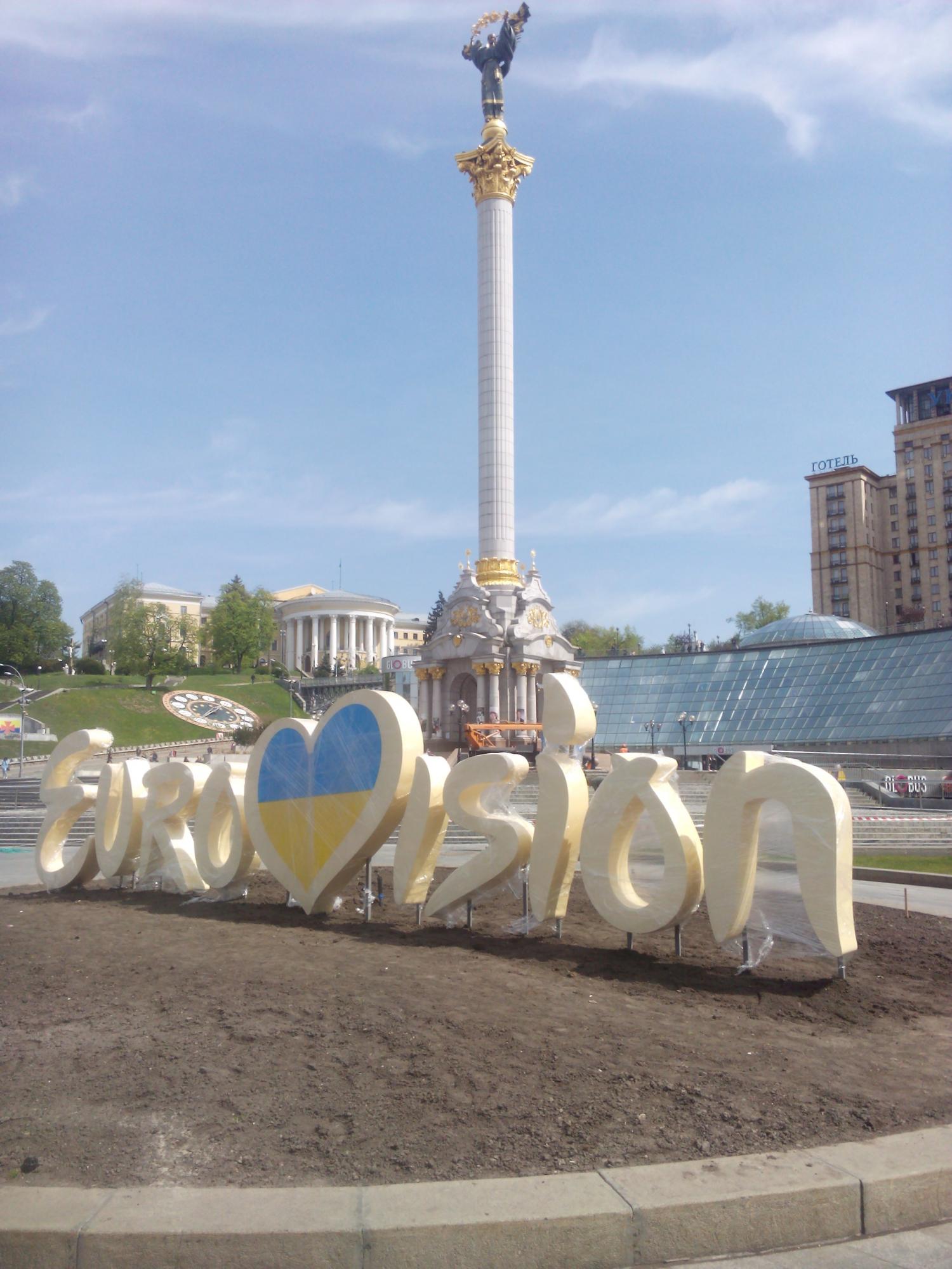 ФОНТАНЫ И КЛУМБА. На Майдане трудятся десятки рабочих, хотя он и не относится к официальным локациям конкурса. Кое-где укладывают плитку и заканчивают подготовку к запуску обновленных светомузыкальных фонтанов, которые должны "заиграть" уже 1 мая. Вечером 25 апреля провели пробный запуск — получилось очень симпатично, хотя вода и забрызгала всю территорию рядом. Появилась на Майдане недалеко от стелы и новая "достопримечательность" — клумба с огромной надписью "Eurovision", в которой буква "V" стилизована под сине-желтое сердечко.