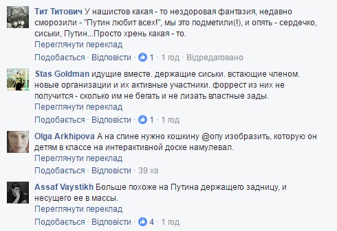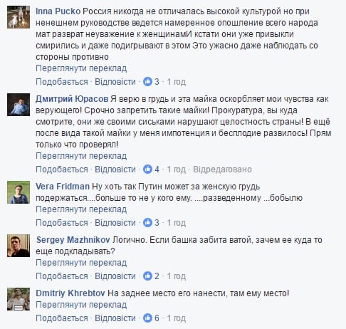 "Путин с сиськами, это пять! Но, не стоит останавливаться, предлагаю разработать вариант с мужскими трусами", "Ху..ло держащее женскую грудь?? Предлагаю это сделать логотипом "единой россии")", "Боюсь предположить, как будет выглядеть мужской вариант этого "прикида", - пишут комментаторы в соцсетях.