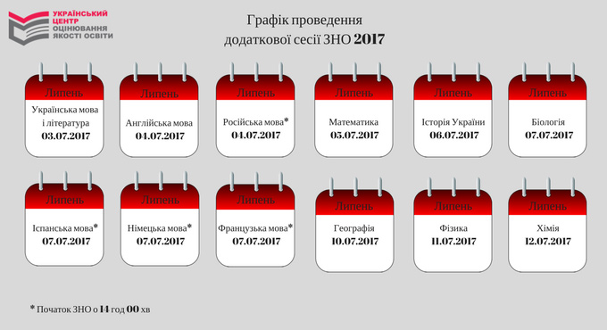 Тестирование по украинскому языку и литературе пройдет 3 июля, по английскому и русскому языкам - 4 июля, математике - 5 июля, истории Украины - 6 июля, биологии, испанскому, немецкому, французскому языкам - 7 июля, географии - 10 июля, физике - 11 июля и по химии - 12 июля.