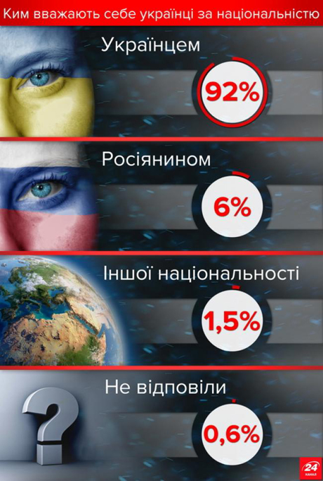 В Украине 92% граждан называют себя этническими украинцами, и лишь 6% граждан считают себя этническими русскими. Об этом свидетельствуют данные опроса, проведенного социологической службой Центра Разумкова. По результатам исследования, еще 1,5% украинцев отнесли себя к другим этносам, информирует Канал 24.