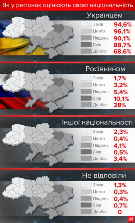 Больше всего украинцев, считающих себя русскими, находится на Донбассе, где 28% опрошенных придерживаются такого мнения. Меньше всего – в западной Украине.