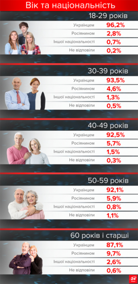 В Центре Разумкова также обнаружили тенденцию, согласно которой доля респондентов, идентифицирующих себя как этнических украинцев, растет со снижением возраста опрошенных. В частности, среди респондентов в возрасте 60 и более лет 87% называют себя украинцами, а в возрасте от 18 до 29 лет – этнических украинцев около 96%.