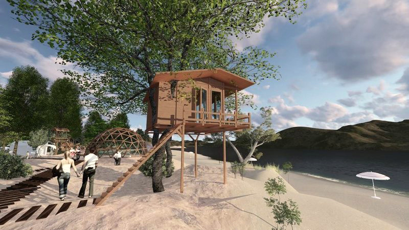 «Скворечник» расположен на Трухановом острове на Днепре, напротив исторического центра украинской столицы. На его территории возведут шесть домиков на деревьях. Один из них станет отелем, другие будут работать как кафе. Помещения будут создаваться без вреда для деревьев, по специальной технологии без использования гвоздей.