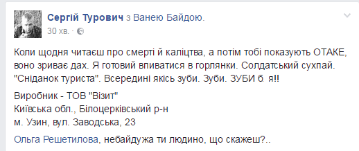 «Когда каждый день читаешь о смерти и увечьях, а потом тебе показывают такое, это срывает крышу. Я готов впиваться в глотки. Солдатский сухпай. «Завтрак туриста». Внутри какие-то зубы. Зубы. Зубы!», — возмутился Турович.