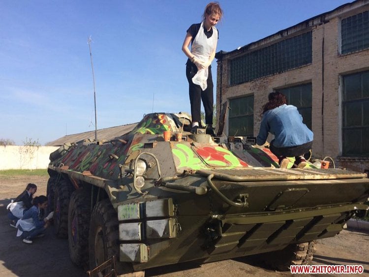 Учні Житомирського вищого професійного училища сервісу і дизайну, Новогуйвинської та Озерненської гімназій, а також діти військових долучились до декорування БТРу, який наразі відновлюють бійці ремонтного батальйону. Прикрашену петриківським розписом, дитячими малюнками та штучками маками бойову машину представлять уранці 9 травня біля монументу «Танк» у селищі Новогуйвинському, що під Житомиром.