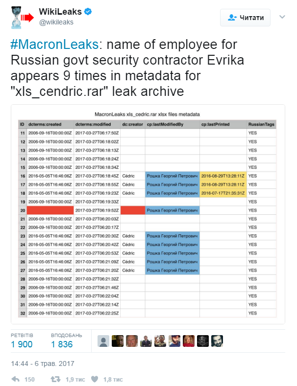 Портал WikiLeaks рассказал, что в метаданных писем, полученных при взломе переписки предвыборного штаба кандидата в президенты Франции Эмманюэля Макрона обнаружены записи с указанием имени и фамилии сотрудника российской компании. Так, в записях девять раз упоминается Рошка Георгий Петрович, который якобы работает в фирме "Эврика", сообщает Главное со ссылкой на Буквы.