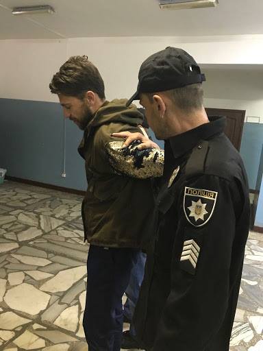 Был задержан охраной конкурса, при участии полиции - оказывал сопротивление при задержании. В порядке ст.208 КПК Украины задержан на 72 часа до суда, который выберет ему завтра меру пресечения по статье 296 ч.3 (хулиганство с отягчающими) - от штрафа до пяти лет лишения свободы.