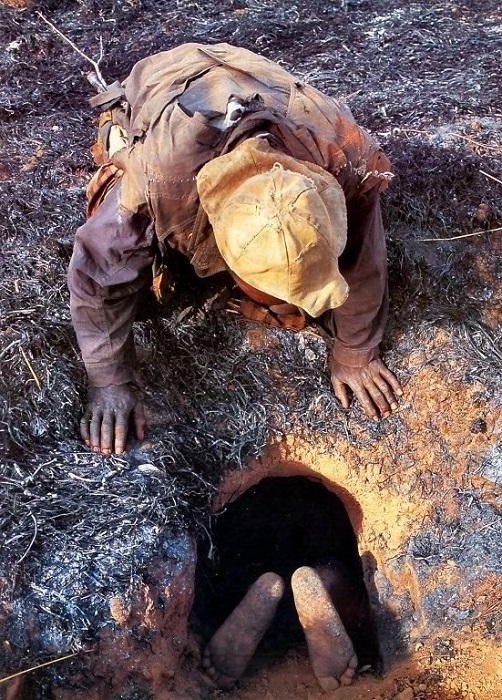 Охотник пробирается в змеиную нору головой вперед. Ползти придется порядка 10 метров, поэтому мужчина мажет свое тело особым составом для лучшего скольжения.