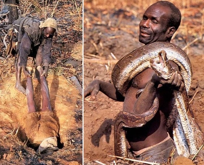 После того, как охотник поймал питона, он ползет с ним обратно из норы, что очень непросто, учитывая вес змеи (порядка 50-70 кг). Напарники вытаскивают его за ноги. Вот здесь начинается самое сложное: питон отчаянно сопротивляется.