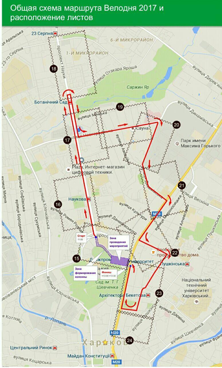 - вул.Сумська - площа Свободи.Зі зміненим маршрутом міського транспорту на даний період можна ознайомитися на сайті "Велодень-2017" (посилання: )