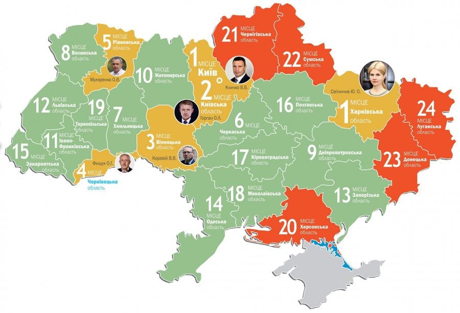 Общую рейтинговую оценку регионов рассчитывали по 64 показателям, которые сгруппированы по 12 направлениям. По 5-ти направлениям Харьковская область входит в пятерку лидеров. Уже второй год подряд наш регион является лидером в образовательной сфере страны - по направлению «Доступность и качество услуг в сфере образования» Харьковская область занимает первое место среди регионов, опережая даже город Киев. Также наша область лидирует по направлениям «Развитие малого и среднего предпринимательства» (2 место), «Эффективность рынка труда» (3), «Возобновляемая энергетика и энергоэффективность» (4), «Социальная защита и безопасность» (4).