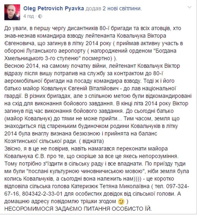 Весною 2014, на самому початку війни, лейтенант Ковальчук Віктор відразу після вишу потрапив на службу за контрактом до 80-ї аеромобільної бригади на посаду командира взводу. Тоді ж і його батько майор Ковальчук Євгеній Віталійович - до лав національної гвардії. В різних бригадах, але з спільною метою були відкомандировані на схід для виконання бойового завдання. В кінці літа 2014 року Віктор загинув під час виконання бойового завдання. До сьогодні батько (майор Ковальчук) до тями не може прийти... Тим часом, земля що знаходиться під стареньким будиночком родини Ковальчуків в літку 2014 була внаглу визнана безхозною і прийнята на баланс Козятинської сільської ради. ( віджата)