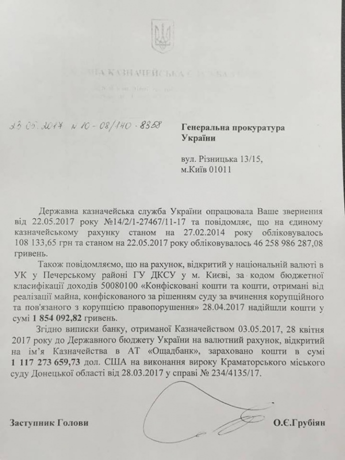 Также отмечается, что на казначейском счету по состоянию на 27 февраля 2014 года находилось 108 134 гривны, а по состоянию на 22 мая 2017 года там уже было 46 258 986 287 грн.