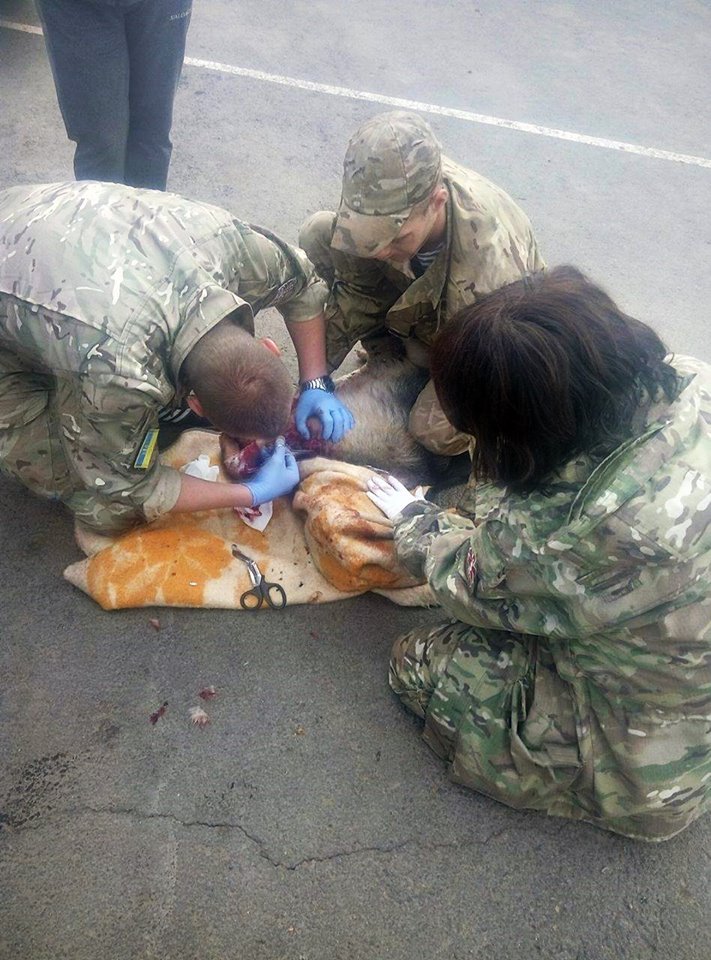 Как следствие, собака получила серьезное повреждена шеи и грудной клетки, также пострадала верхняя часть лапы. Медики «ASAP RESCUE» предоставили собаке первую домедицинскую помощь, а специалисты из Часов Яра - первую медицинскую помощь. За жизнь собаки полтора часа боролись в Торецкое военный анестезиолог, военный хирург и хирург «ASAP RESCUE».