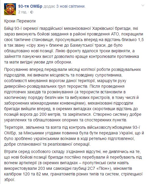 Бійці 93-ї окремої гвардійської механізованої Харківської бригади, які зараз виконують бойові завдання в районі проведення АТО, покращили своє тактичне становище, просунувшись вперед на відстань близько 1,5 в так звану «сіру зону» ближче до Бахмутської траси, де було облаштовано нові позиції. Лінію фронту вдалося трохи вирівняти, а зайняття пануючих висот дозволило краще контролювати противника та мати вигідні умови для оборони.