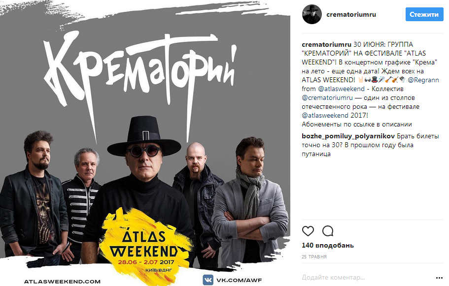 К тому же, на официальном сайте Atlas Weekend также есть подтверждение участия группы "Крематорий" в рамках мероприятия.