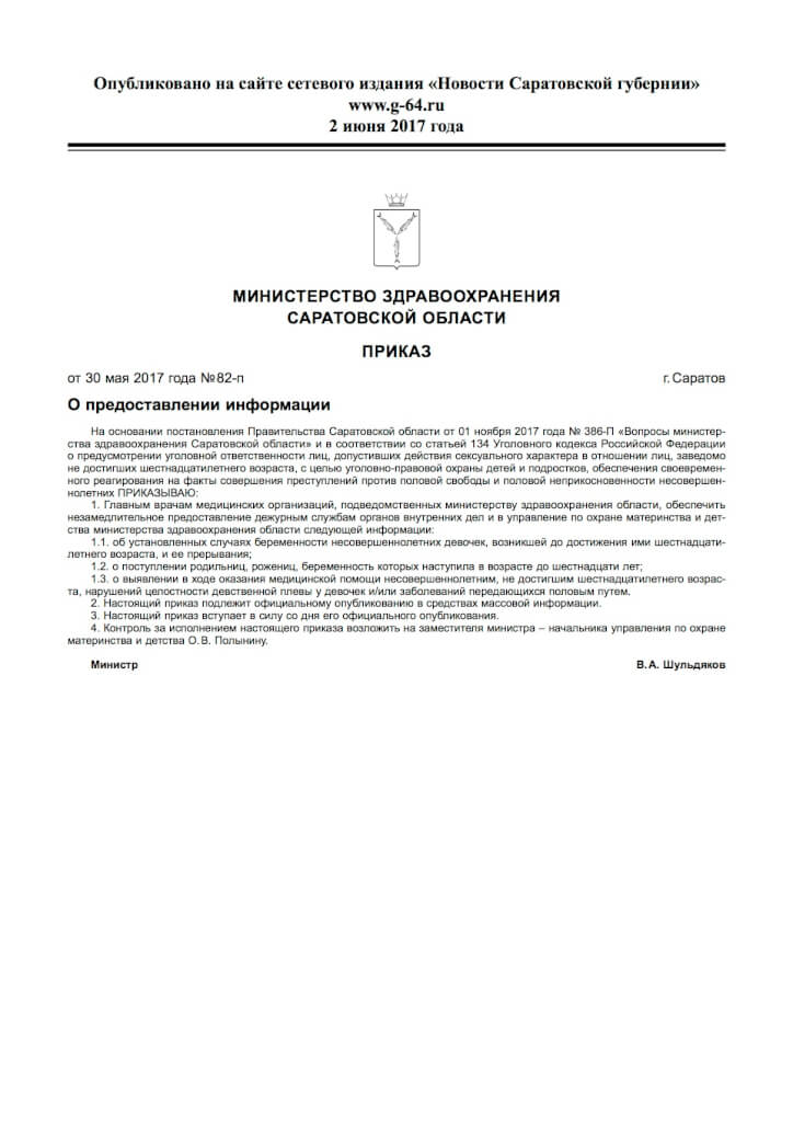 Министерство здравоохранения Саратовской области обязало врачей сообщать в полицию о пациентках младше 16 лет, которые лишились девственности. Такой приказ за подписью регионального министра здравоохранения Владимира Шульдякова опубликован в официальной базе данных, пишет Медуза.