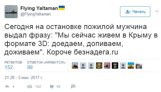 "Сегодня на остановке пожилой мужчина выдал фразу: "Мы сейчас живем в Крыму в формате 3D: доедаем, допиваем, доживаем". Короче безнадега.ru", - пишет пользователь Twitter Flying Yaltaman.