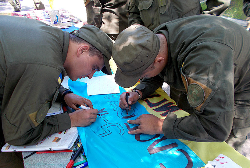 Особовий склад 5-ї Слобожанської бригади також долучився до цієї акції. Колекцію волонтерів було поповнено нарукавними знаками Національної гвардії. Також у виставці прапорів зайняв своє почесне місце український прапор з побажаннями та автографами бійців з’єднання.