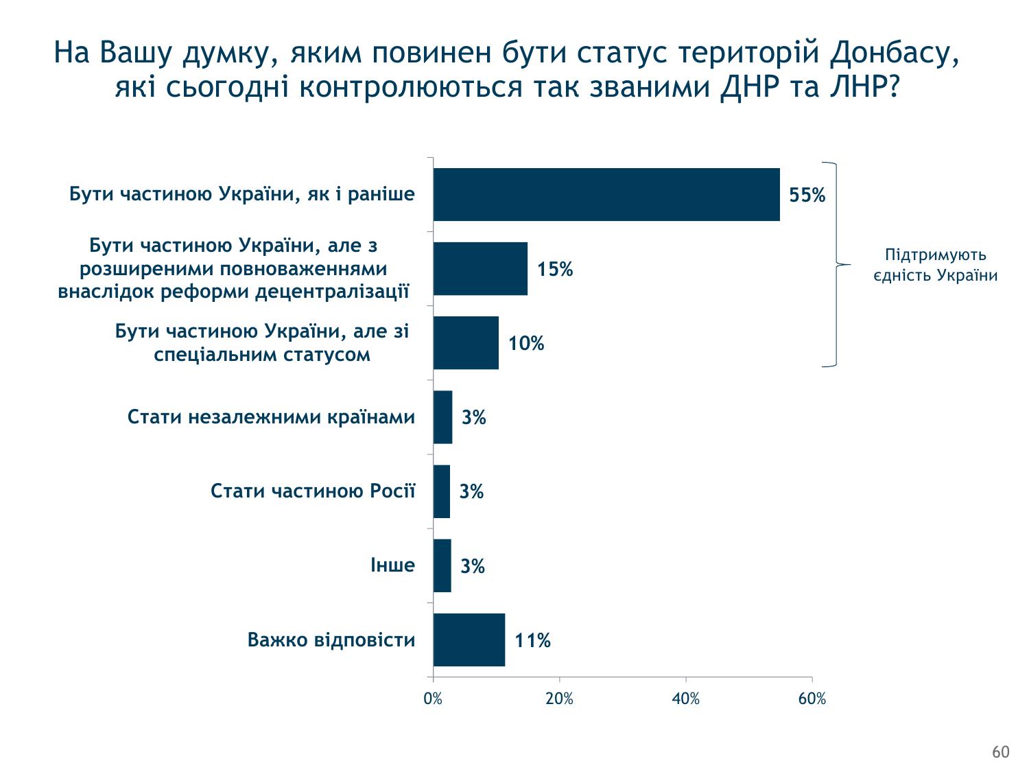 Большинство украинцев (55%) считают, что оккупированные Россией районы Донецкой и Луганской областей должны быть частью Украины, як и раньше, свидетельствуют данные опроса Социологической группы "Рейтинг".