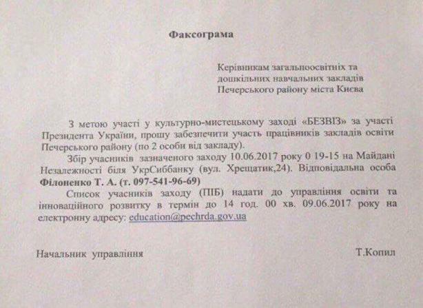 Руководство дошкольных и общеобразовательных учебных заведений одного из районов столицы получило от Управления образования и инновационного развития Печерской районной государственной администрации указание "обеспечить явку сотрудников на празднование культурного мероприятия "БЕЗВИЗ". В данном мероприятии утром принимал участие глава государства Петр Порошенко.