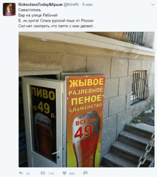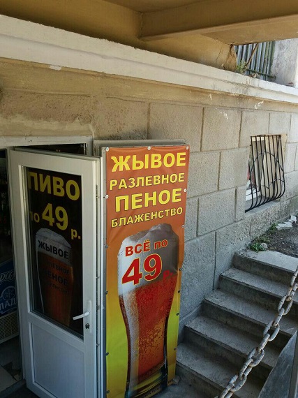 Пользователи социальных сетей обсуждают фотографию рекламной вывески одного из питейных заведений оккупированного РФ Севастополя.