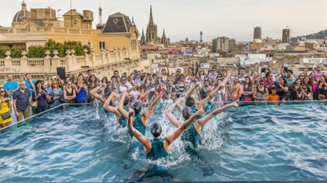 Чемпионы Испании по синхронному плаванию, в категории младшая группа, выступили с классической программой под современную музыку. Всего было две сессии между которыми можно было провести приятно время на террасе, с видом на оживленную Via Laietana и Готический собор.