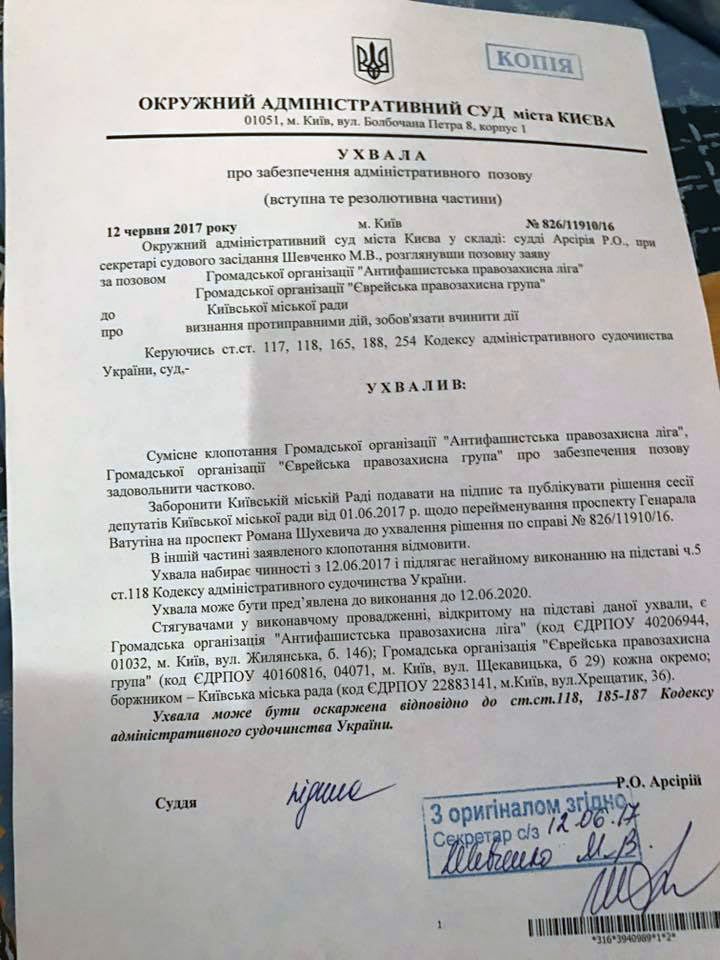 Окружной административный суд Киева 12 июня запретил Киевскому городскому совету подписывать и публиковать решение о переименовании проспекта Генерала Ватутина в проспект Романа Шухевича.