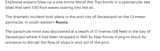 В скандальной заметке, опубликованной на сайте Daily Mail 12 июня 2017 года, рассказывается о подрыве в море возле оккупированного Севастополя немецкой мины времен Второй мировой войны. При этом в материале отмечается, что город расположен на Крымском полуострове "на юго-западе России".