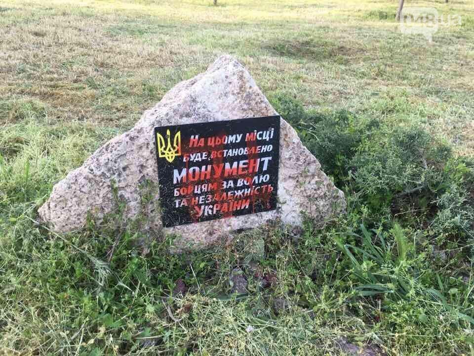 Кроме того, накануне красной краской был залит памятный знак на месте, где планируется возведение памятника Героям Украины, отмечает 048.